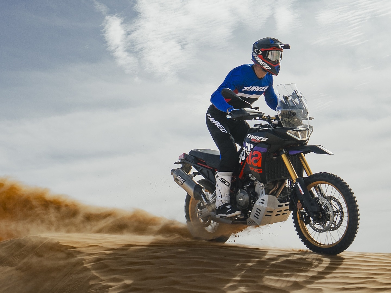 The Aprilia Tuareg Rally offers fast and responsive throttle response, perfect for overcoming obstacles when off-road riding. The SC Project exhaust, designed specifically for the Rally, is made of titanium and features a racing-style end cap with a 60 mm outlet, enhancing performance, sound, and reducing the bike’s overall wet weight to just 199 kg. With four riding modes – Urban, Explore, Off-Road and Individual – you can customise all key APRC electronic parameters depending on whether you’re after maximum riding precision or looking to unleash the bike’s full might and aggression.