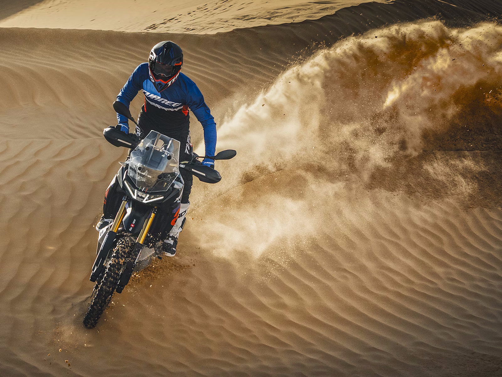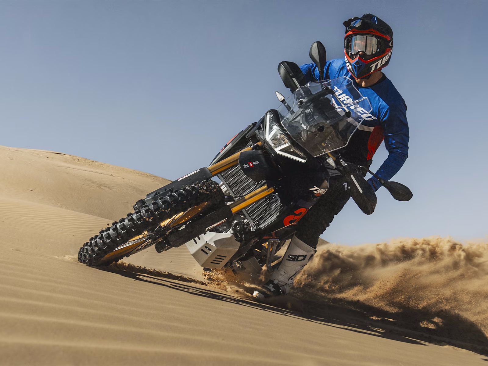 The Aprilia Tuareg Rally is available in the very same distinctive rally race replica colour of the bike ridden by Jacopo Cerutti when he crossed the legendary Dakar finishing line in first place. The fork, wheel rims and handlebar, designed for the very toughest Enduro riding, are all finished in a sporty anodised gold colour, while tapered lines, a reinforced aluminium sump and a new high mudguard showcase the bike’s uncompromising off-road character. The seat and handlebar offer increased control while riding in standing position on particularly extreme stretches.