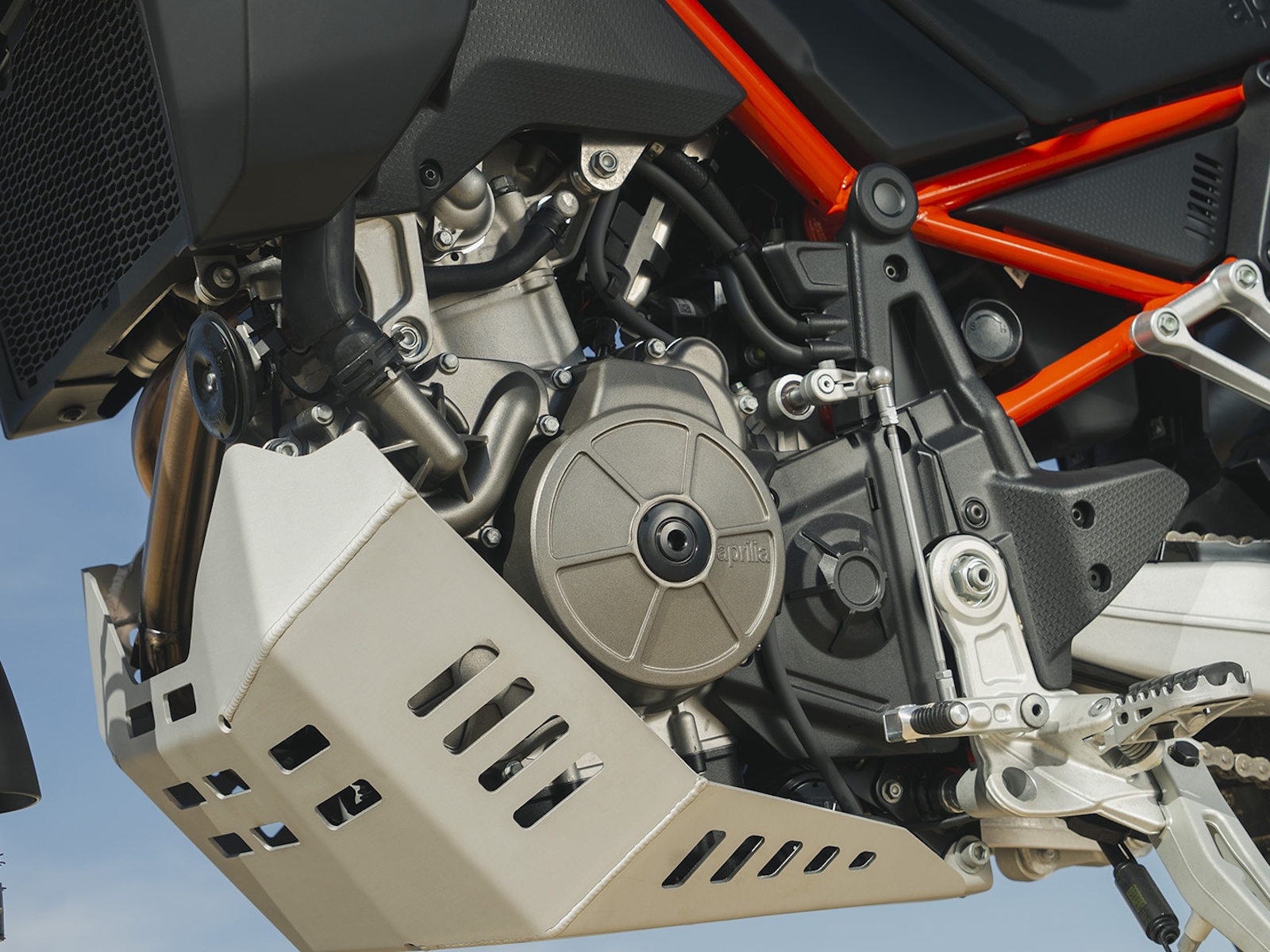The Aprilia Tuareg Rally is equipped for the most challenging off-road conditions, thanks to heavy-duty spoked wheels with narrow Ergal rims, a reinforced aluminium skid plate and knobby tyres with inner tubes. The fully-adjustable Kayaba suspension provides 240 mm of travel, the best among twin-cylinder bikes, and features linear constant-rate springs that enhance handling on rough terrain and reduce static sag, adding height to the bike.